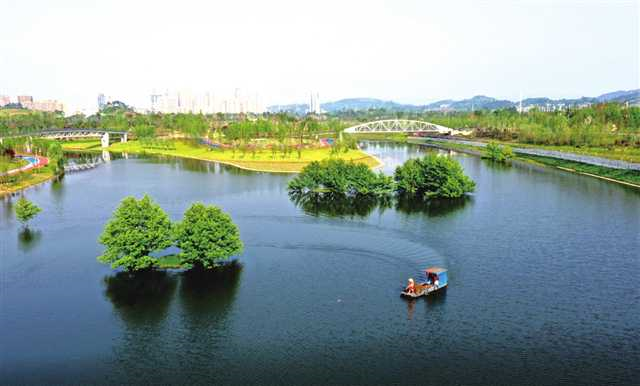 一河碧水穿城过,两岸秀色锁清波,一幅水清岸绿的美好画卷跃然纸上。
