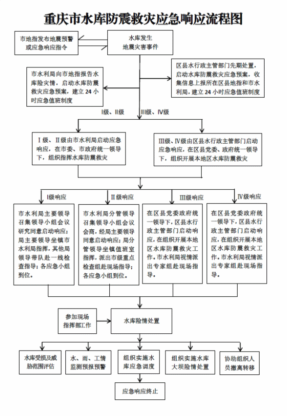 1.当区县地指启动地震灾害IV级应急响应、因震区县防指发布工程灾害IV级预警,区县水行政主管部门应相应启动水库防震救灾IV级响应。